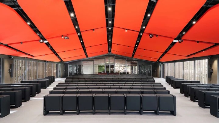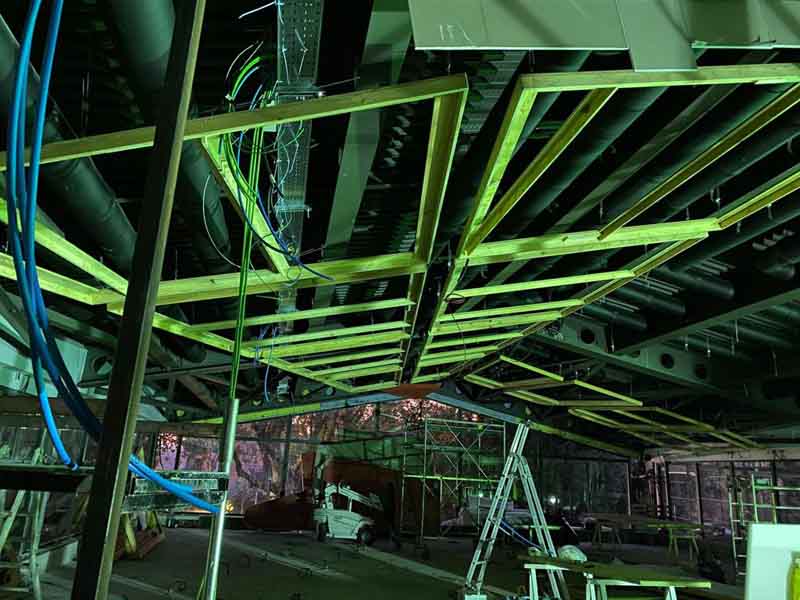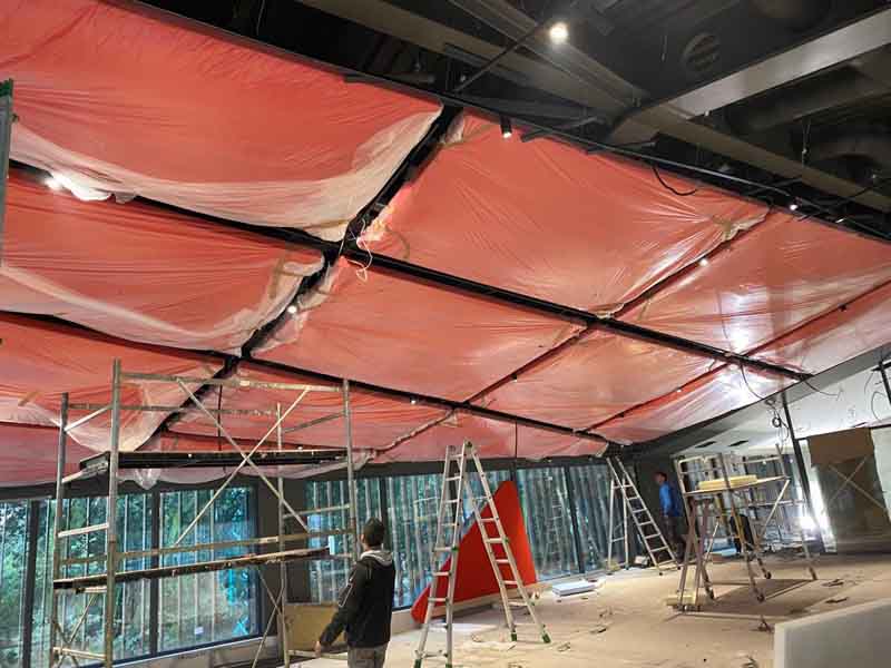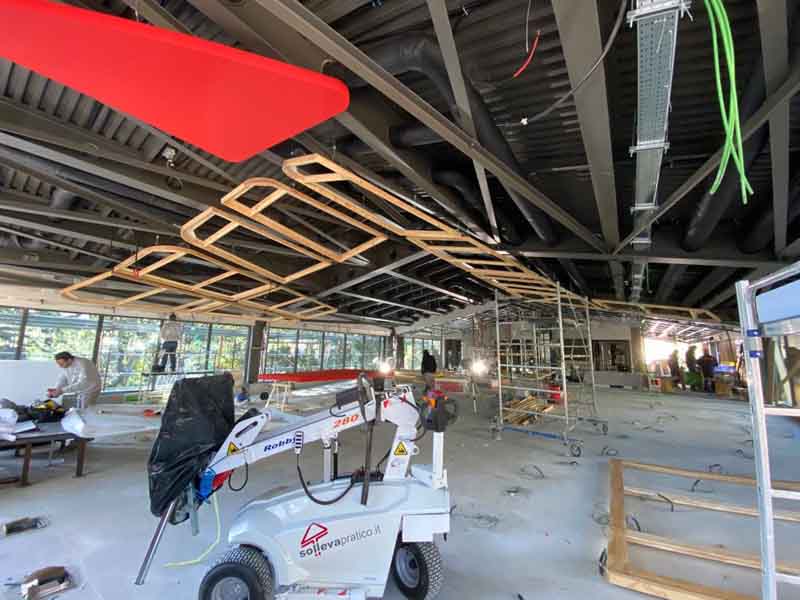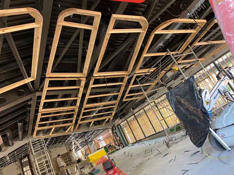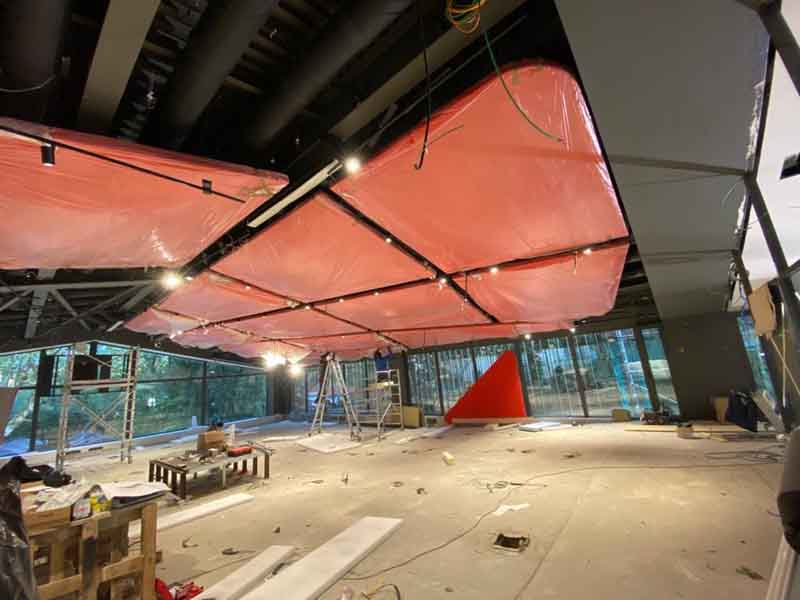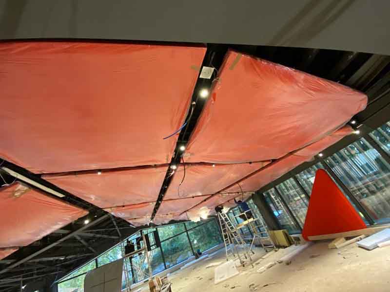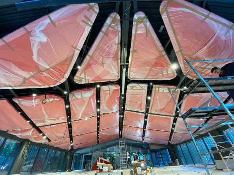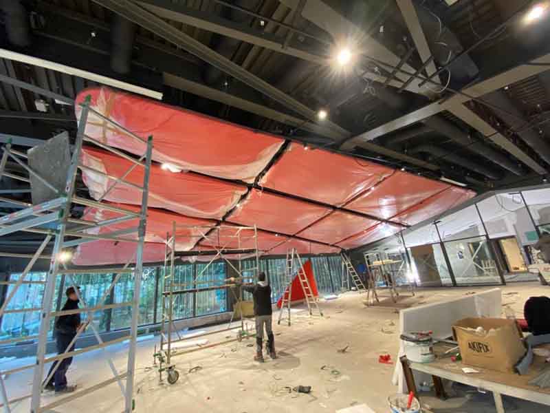 Soffitto in legno di pino, come da progetto abbiamo realizzato diverse strutture di forme disuguali grazie ad una tecnica di sagomatura del legno e incollaggio. Abbiamo costruito circa 30 sagome verniciate con vernice ignifughe e rivestite con tessuto, ancorate a soffitto con tiranti in acciaio. Terminato il lavoro queste sagome ricordano delle vele sospese.soffitto in legno di pino, come da progetto abbiamo realizzato diverse strutture di forme disuguali grazie ad una tecnica di sagomatura del legno e incollaggio. Abbiamo costruito circa 30 sagome verniciate con vernice ignifughe e rivestite con tessuto, ancorate a soffitto con tiranti in acciaio. Terminato il lavoro queste sagome ricordano delle vele sospese.